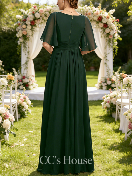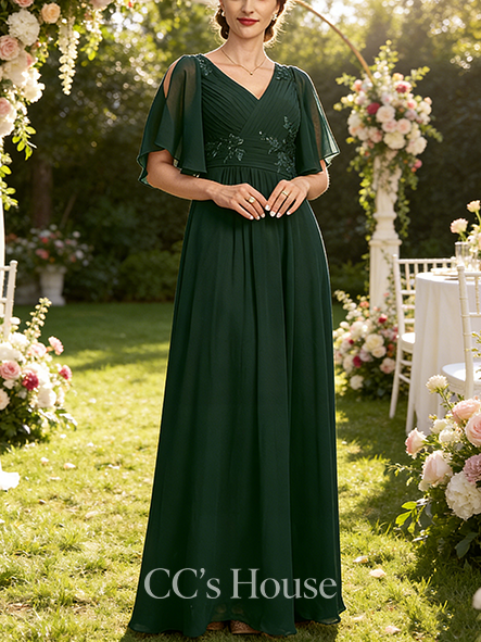 • A-line Elegant V-Neck Floor-Length Chiffon Mother of the Bride Dress With Pleated Sequins Appliques Lace