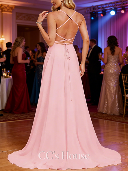 - A-line Elegant V-Neck Sweep Train Satin Prom Dresses