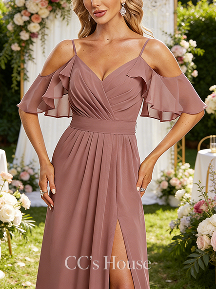 A-line Charming Cold Shoulder Floor-Length Chiffon Bridesmaid Dress With Ruffle