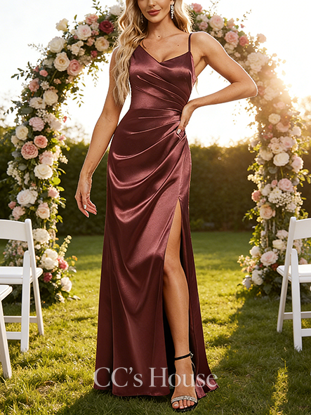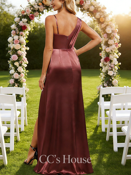 • A-line Sleek Asymmetrical Floor-Length Stretch Satin Bridesmaid Dress