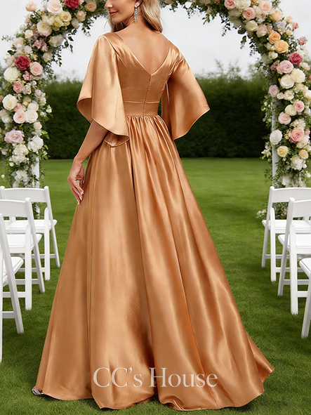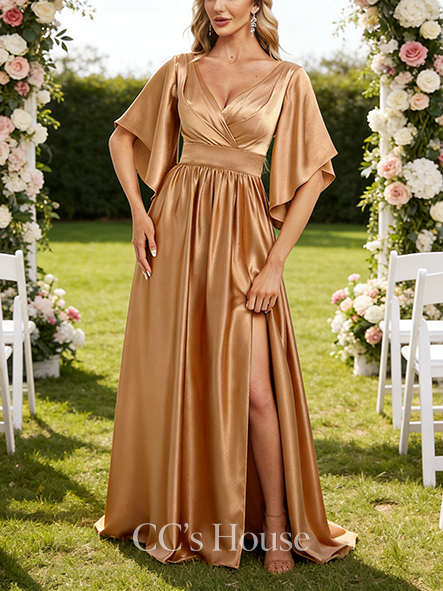 • A-line Stretchy V-Neck Floor-Length Stretch Satin Bridesmaid Dress