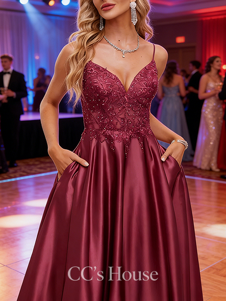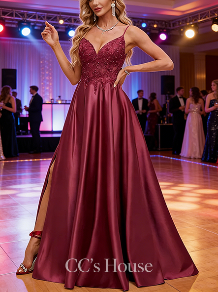 - A-line Elegant V-Neck Sweep Train Satin Prom Dresses