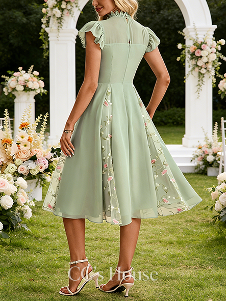 Embroidered High Neck Short Sleeve Flutter Sleeve A-line Wedding Guest Dress Majestic Chiffon Tulle Midi Dress