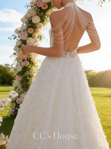 • Halter Neck A-Line Bridal Gown - Sweep Train Lace Wedding Dress with Beading and Sparkling Sequins