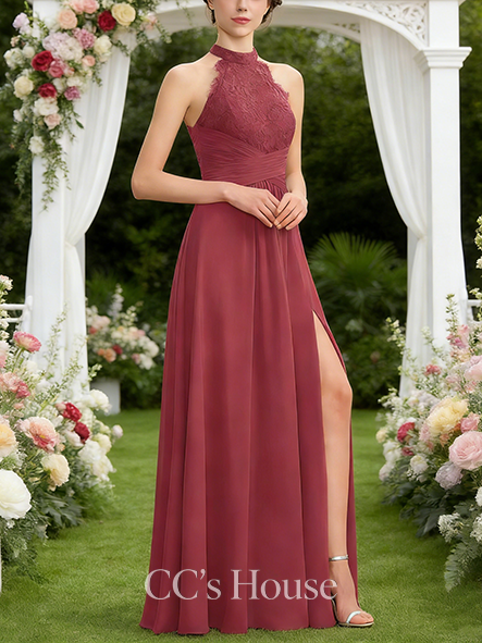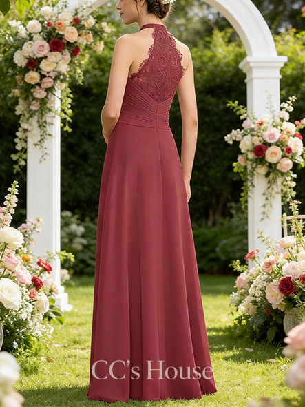 • Junior A-line Modest High Neck Floor-Length Lace Chiffon Bridesmaid Dress With Ruffle