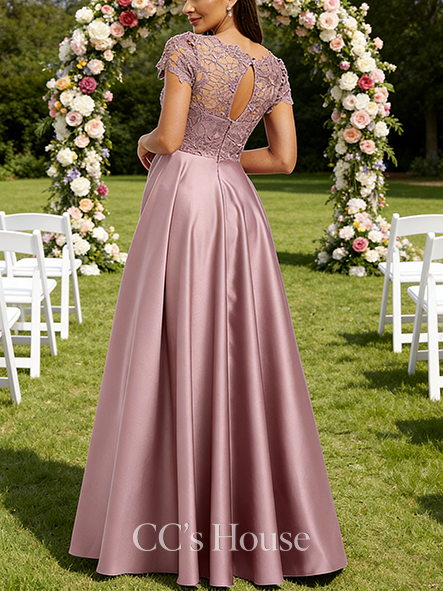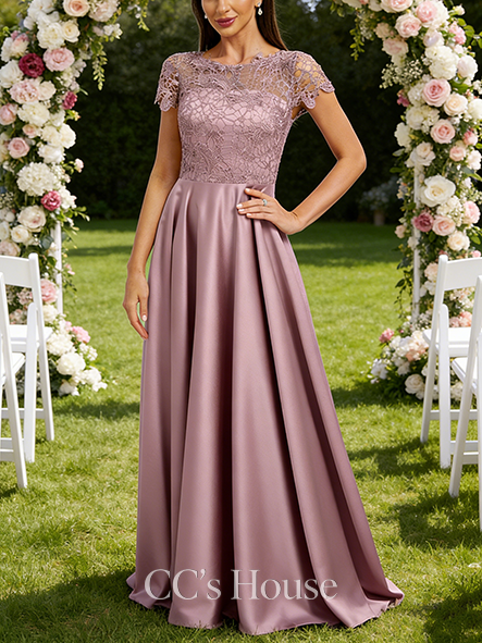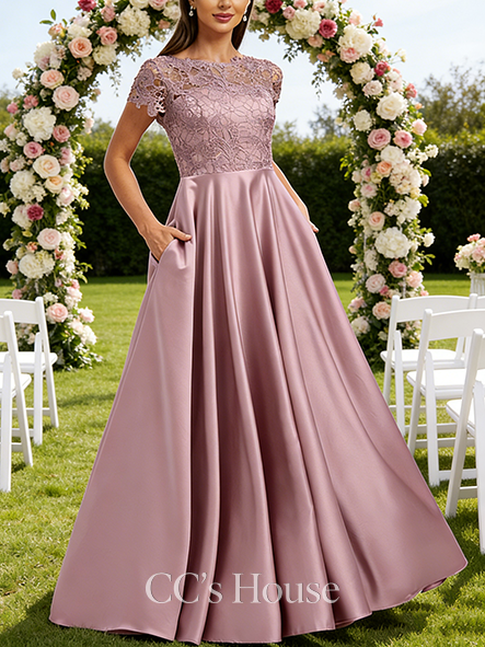 • Junior A-line Vintage Scoop Floor-Length Satin Lace Bridesmaid Dress