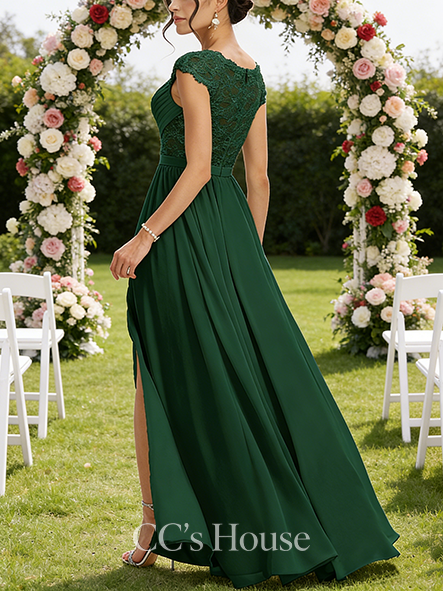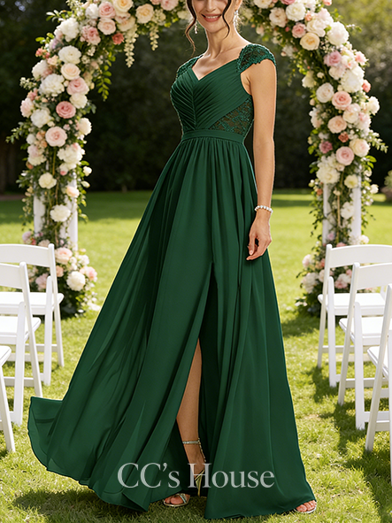 • New Arrival A-line Lace-Embellished V-Neck Floor-Length Lace Chiffon Bridesmaid Dress