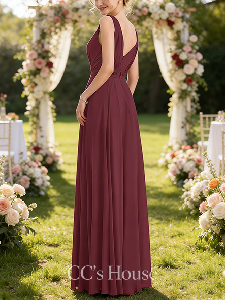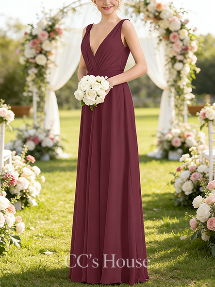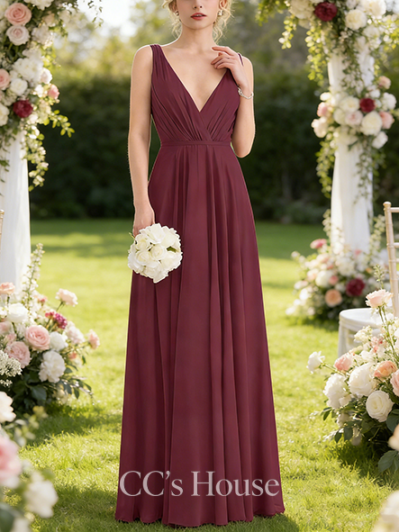 New Arrival A-line Neat V-Neck Floor-Length Chiffon Bridesmaid Dress With Pleated