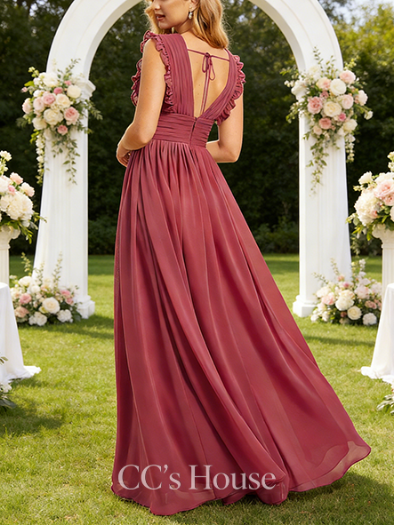 • New Arrival A-line Romantic V-Neck Floor-Length Chiffon Bridesmaid Dress With Ruffle