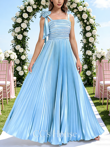 New Arrival A-line Structured Square Floor-Length Stretch Satin Bridesmaid Dress With Bow Pleated