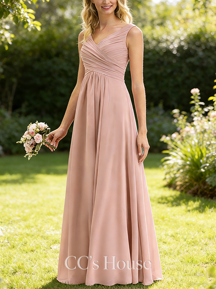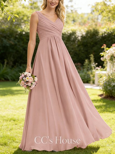 New Arrival A-line Tailored V-Neck Floor-Length Chiffon Bridesmaid Dress With Pleated