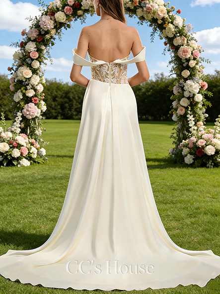 • Off-the-Shoulder A-Line Bridal Gown - Court Train Satin Lace Wedding Dress with 3D Floral Appliqu