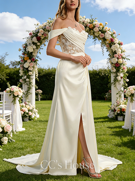 Off-the-Shoulder A-Line Bridal Gown - Court Train Satin Lace Wedding Dress with 3D Floral Appliqu