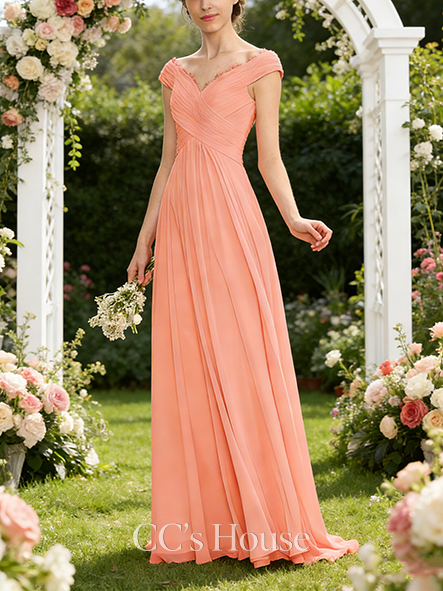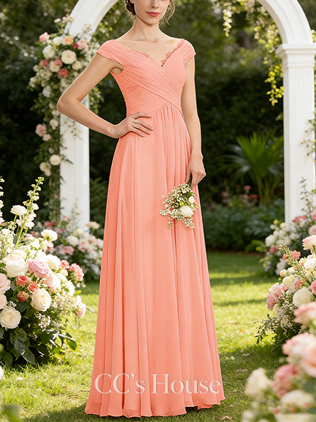 • Plus Size A-line Lovely Off the Shoulder Floor-Length Chiffon Lace Bridesmaid Dress With Ruffle