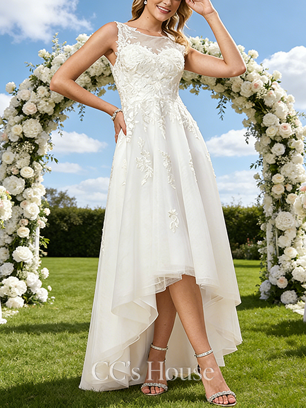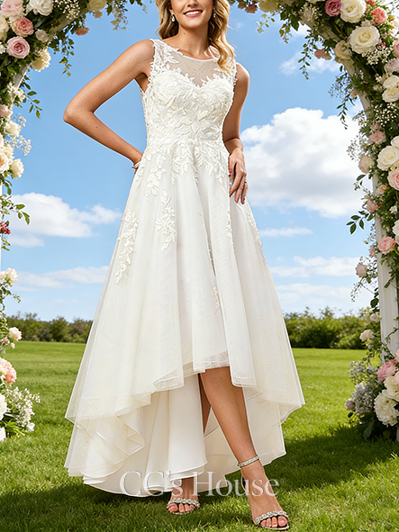 Scoop Illusion Neck A-Line Bridal Gown - Asymmetrical Tulle Lace Wedding Dress with Sequins