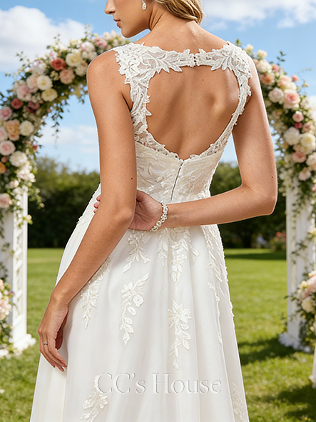 V-Neck A-Line Bridal Gown - Sweep Train Chiffon Lace Wedding Dress
