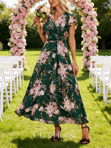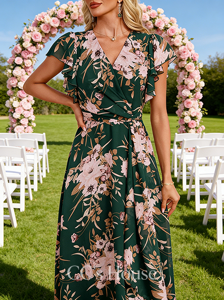 • Short A-line Breezy V-Neck Ankle-Length Chiffon Bridesmaid Dress With Ruffle