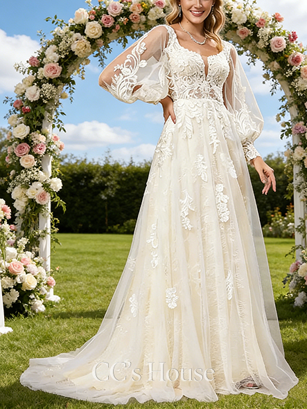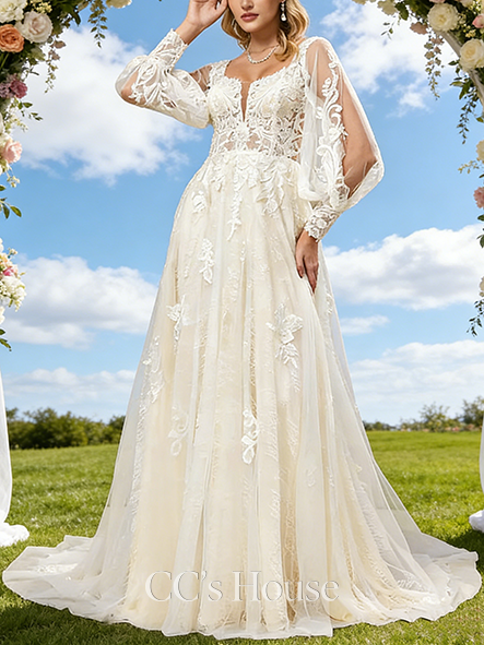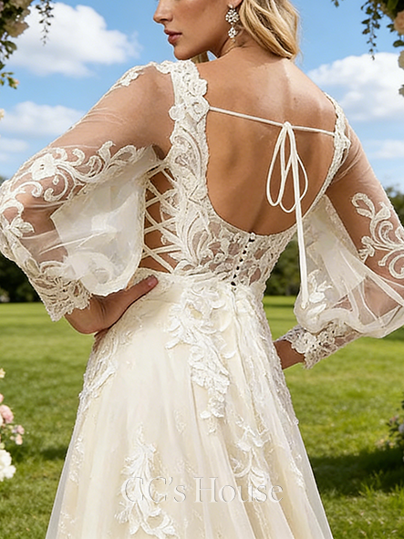 • Square Neck A-Line Bridal Gown - Court Train Tulle Lace Wedding Dress