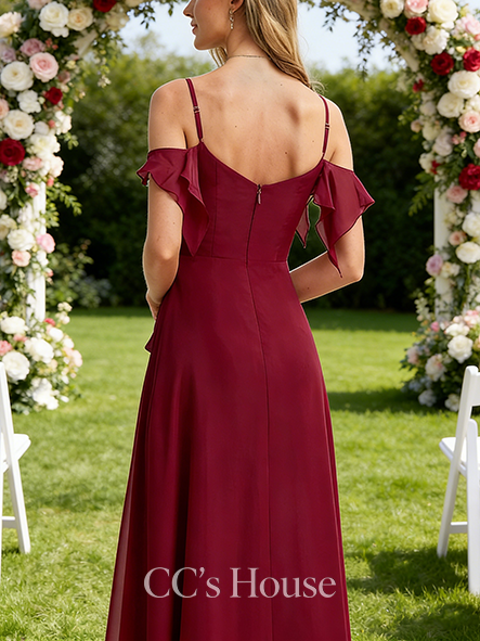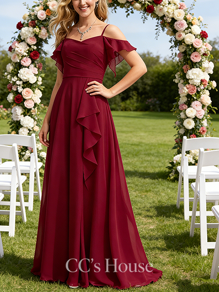 • Under $100 A-line Fresh Cold Shoulder Floor-Length Chiffon Bridesmaid Dress With Ruffle