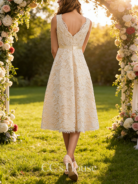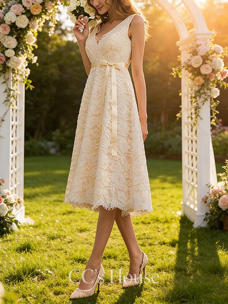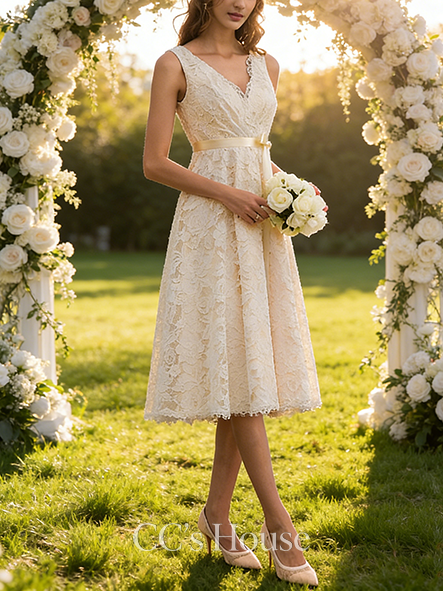 • A-line Adorable V-Neck Knee-Length Lace Wedding Dress With Bow