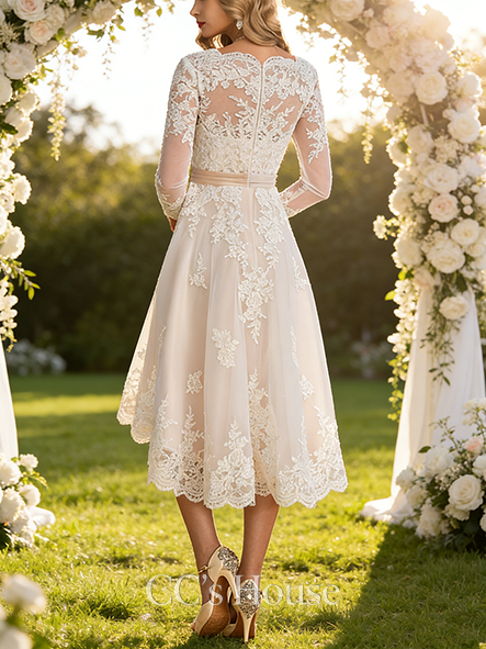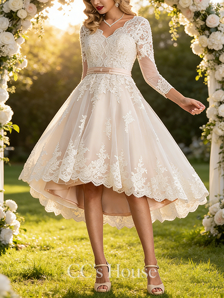 • A-line Chic V-Neck Asymmetrical Satin Tulle Lace Wedding Dress