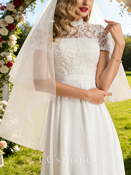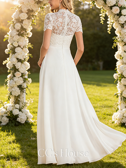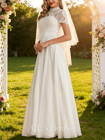 • A-line Elegant High Neck Floor-Length Lace Chiffon Wedding Dress