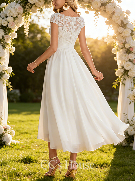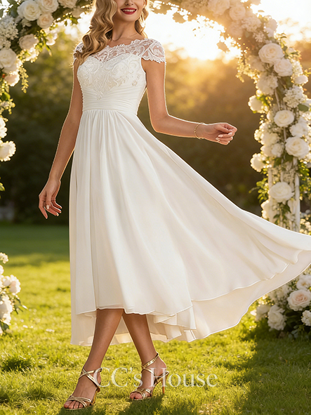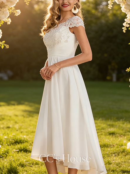 • A-line Elegant Scoop Asymmetrical Lace Chiffon Wedding Dress With Cape