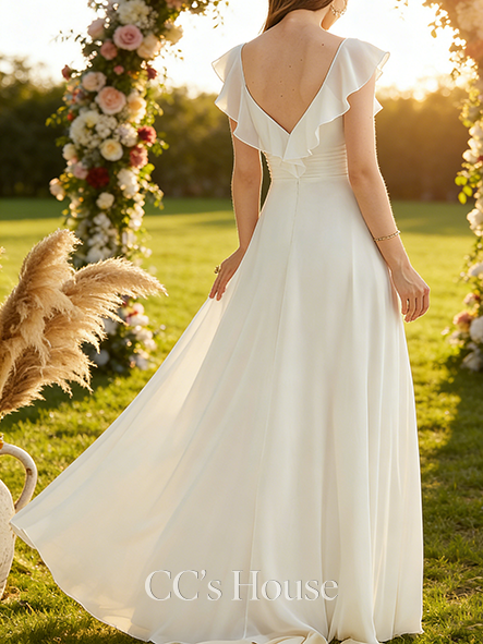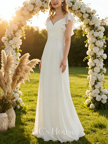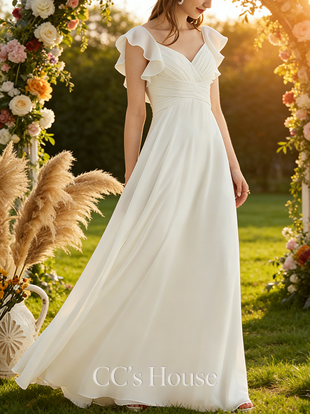 • A-line Flowy V-Neck Floor-Length Chiffon Wedding Dress With Ruffle
