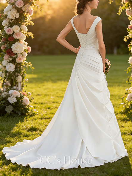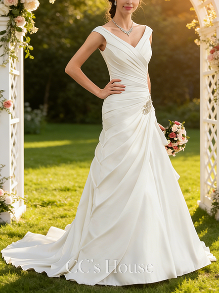 • A-line Luxurious V-Neck Court Train Satin Wedding Dress With Beading