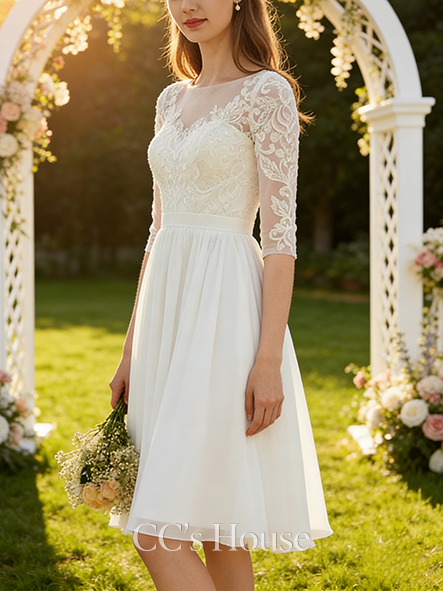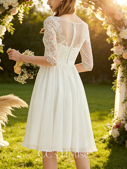 • A-line Sparkling Scoop Knee-Length Lace Chiffon Wedding Dress With Sequins