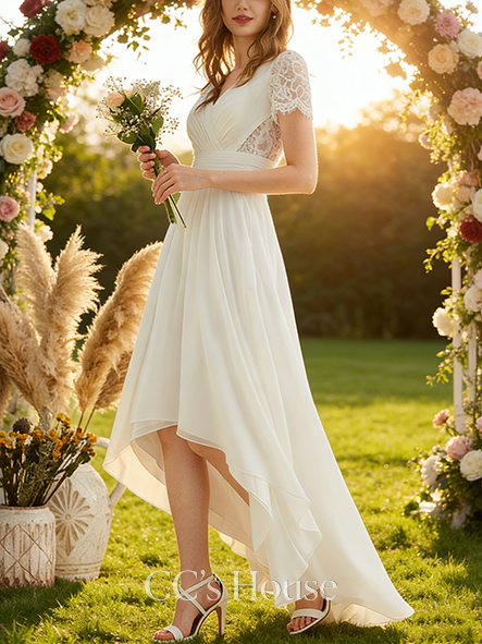 • A-line Unique V-Neck Asymmetrical Lace Chiffon Wedding Dress