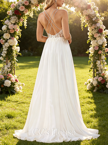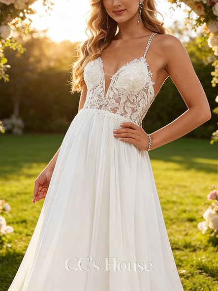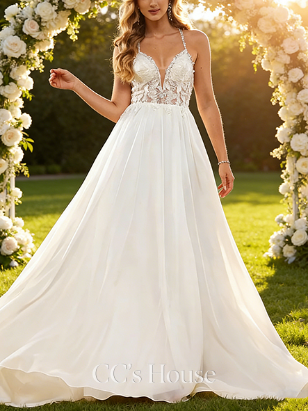 - A-line Elegant V-Neck Court Train Lace Chiffon Wedding Dress