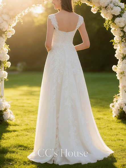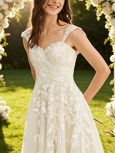 - A-line Chic V-Neck Asymmetrical Satin Lace Wedding Dress