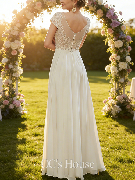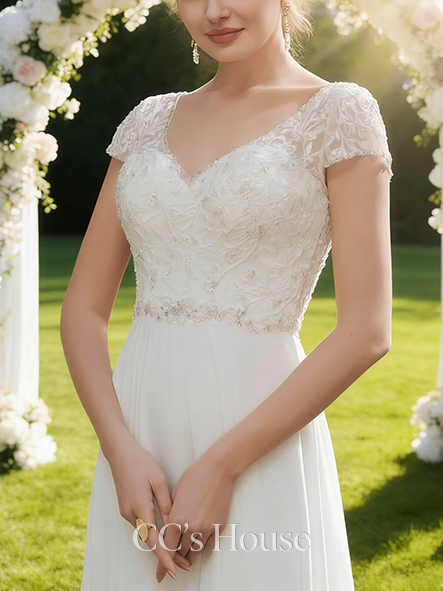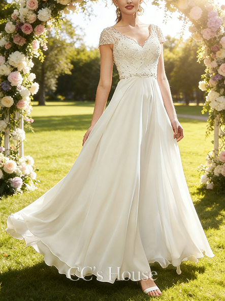 Elegant A-Line V-Neck Floor-Length Chiffon Lace Sequin Beaded Bridal Wedding Dress