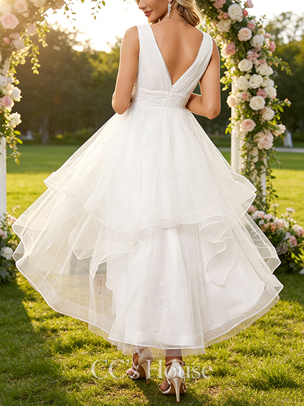• Elegant A-Line V-Neck Wedding Dress - Floor-Length Asymmetrical Tulle with Pleated Cascading Ruffles