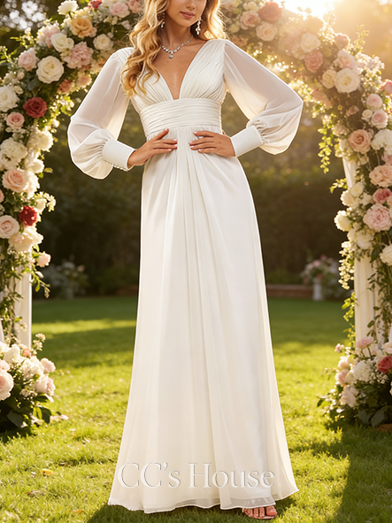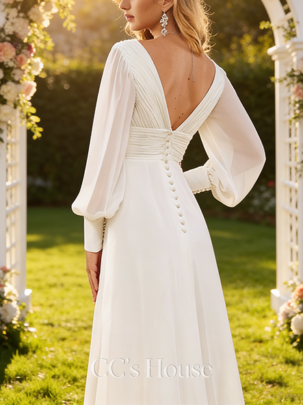 • Elegant A-Line V-Neck Wedding Dress - Floor-Length Chiffon with Ruffle Detailing