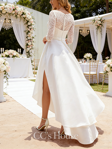• Glamorous A-Line Scoop Neck Asymmetrical Satin Lace Wedding Dress With Sequins