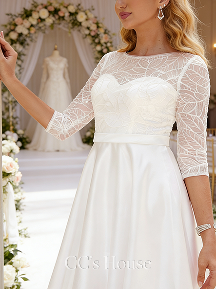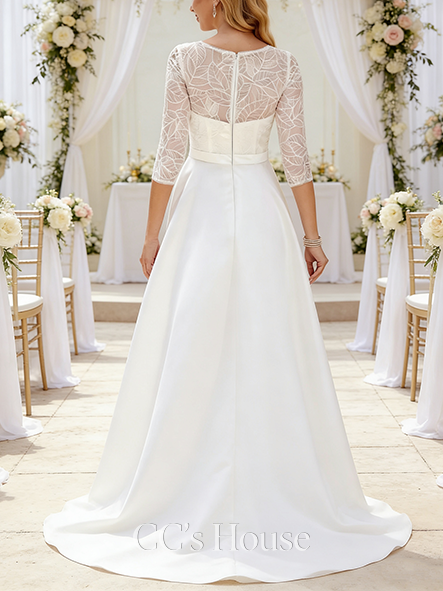 Elegant A-Line Scoop Neck Wedding Dress - Sweep Train Satin Bridal Gown