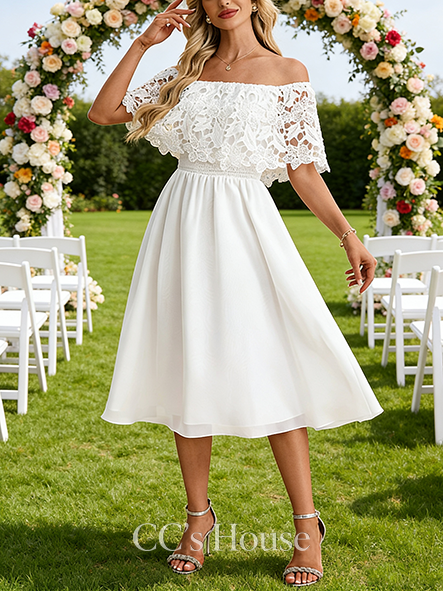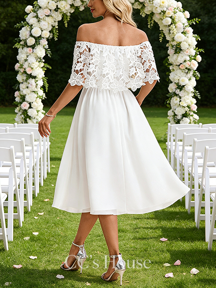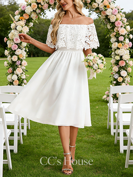 - A-line Chic V-Neck Asymmetrical Satin Lace Wedding Dress