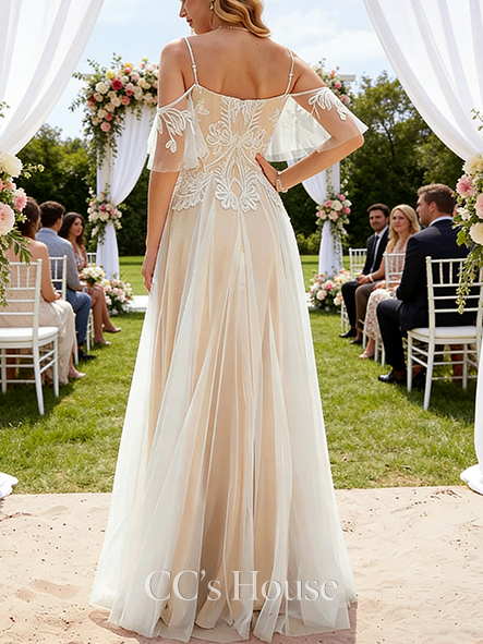 • Romantic A-Line Cold Shoulder Floor-Length Tulle Lace Wedding Dress