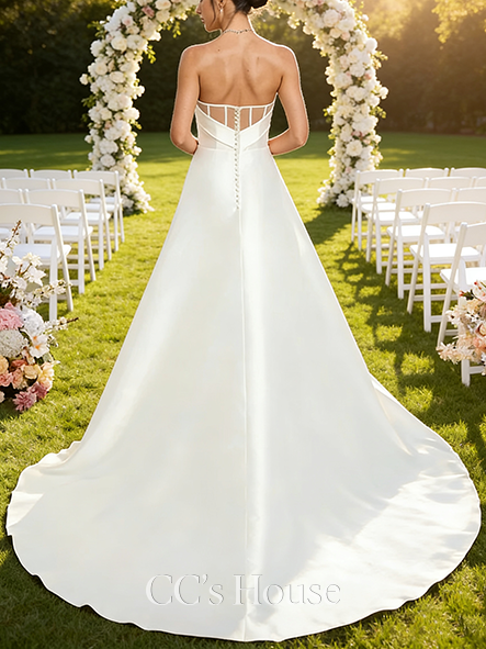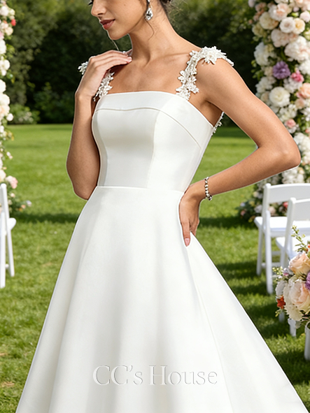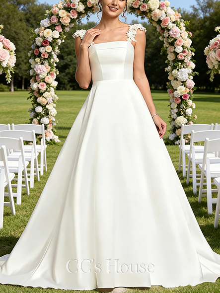 Square Neck A-Line Bridal Gown - Straight Chapel Train Satin Lace Wedding Dress