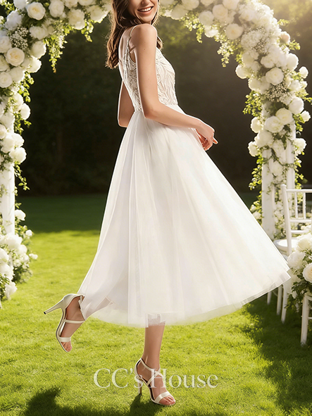 Elegant A-Line V-Neck Tea-Length Tulle Lace Bridal Wedding Dress