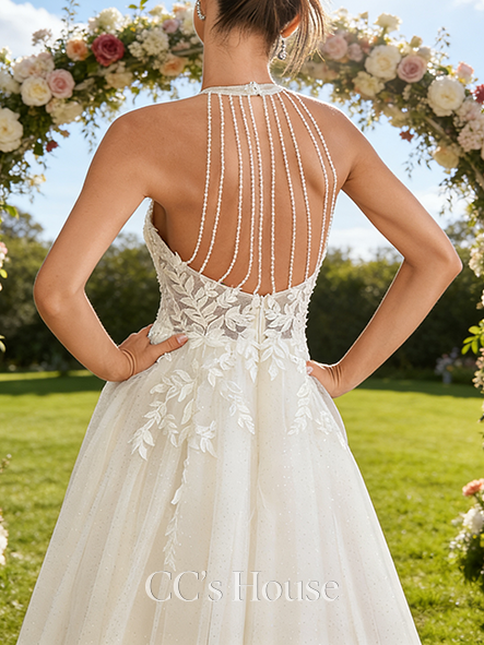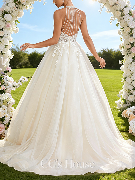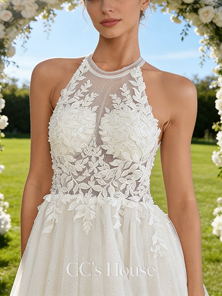 Halter Neck A-Line Bridal Gown - Court Train Lace Tulle Wedding Dress with Beading and Sparkling Sequins