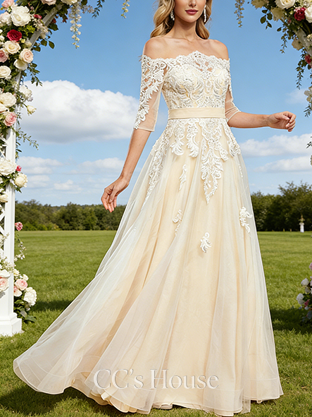• Off-the-Shoulder A-Line Bridal Gown - Floor-Length Tulle Lace Wedding Dress with Sequins