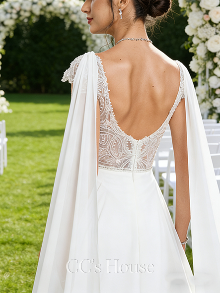 Illusion Scoop Neck A-Line Bridal Gown - Sweep Train Lace Chiffon Wedding Dress with Cape