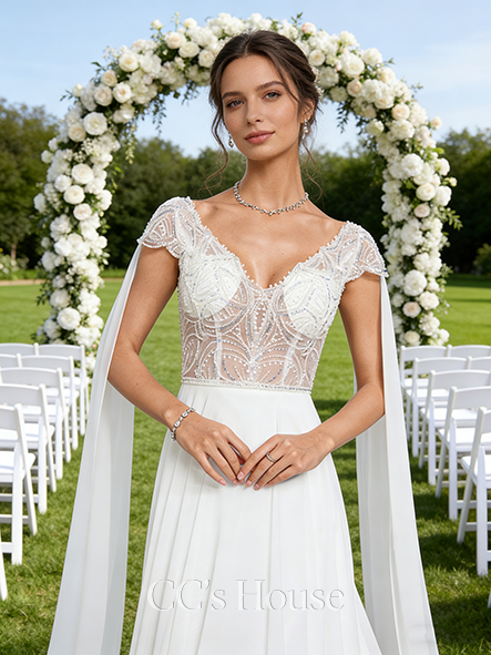 V-Neck A-Line Bridal Gown - Chapel Train Chiffon Lace Wedding Dress with Beading and Sequins