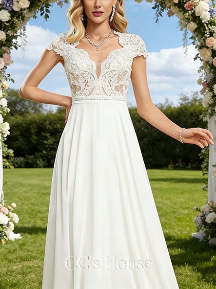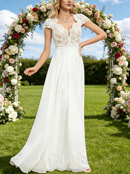 V-Neck A-Line Bridal Gown - Floor-Length Lace Chiffon Wedding Dress with Cape