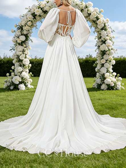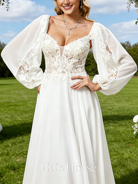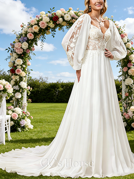• V-Neck A-Line Bridal Gown - Sweep Train Chiffon Lace Wedding Dress