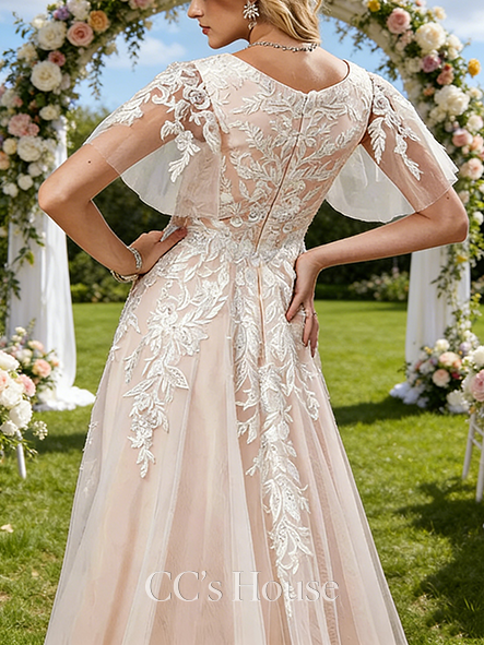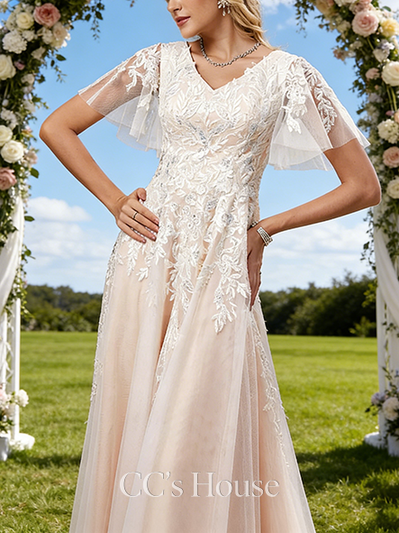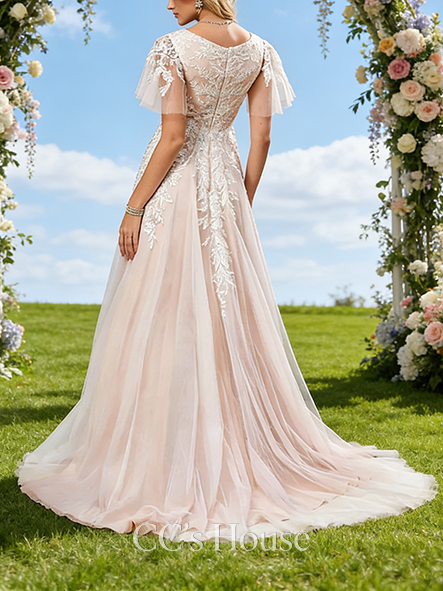 V-Neck A-Line Bridal Gown - Sweep Train Lace Tulle Wedding Dress with Sequins
