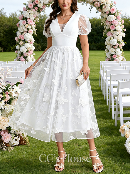 • V-Neck A-Line Bridal Gown - Tea-Length Lace Wedding Dress with Elegant Embroidered Details